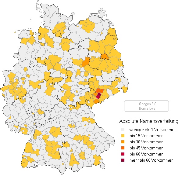 Der besagte Ort Ponitz liegt an der Pleiße im Altenburger Land. Die Gründung des Ortes wird in der Zeit zwischen 900 und 1200 n.Chr. angenommen, als die Sorben (slawische Siedler) allein im Altenburger Land rund 300 Dörfer anlegten. Die erste urkundlich belegte Schreibweise "Ponicz" stammt aus der Zeit um 1254. Zur Bedeutung des Ortsnamens gibt es wiederum zwei Annahmen: Weit verbreitet ist die Variante, dass sich der Name aus dem sorbischen Wort "poniz" (= erniedrigen, vertiefen) ableitet, was auf seine Lage in einer Senke hindeutet. Demnach wäre der Name Ponitz ein Landschaftsname. Eine andere Variante geht vom slawischen Begriff für "Brandrodung" aus und versucht den Ortsnamen dadurch zu erklären, wie die Waldflächen der Gegend in landwirtschaftliche Nutzflächen umgewandelt wurden. Der Ort Ponitz wurde schon früh mit dem zugehörigen Schloß Ponitz erwähnt. Aufgrund seiner Größe war das Schloß und das dazu gehörende Rittergut eines der bedeutendsten im Herzogtum Sachsen-Altenburg. Dem Schloß standen die Ober- und Erbgerichte über alle Dörfer des Kirchspiels zu (Ponitz, Schönhain, Guteborn, Gosel, Zschöpel, Dreussen). Die ältesten Nachrichten von Schloß Ponitz reichen bis ins Jahr 1254 zurück. Die Besitzer waren damals die Herren von Ponicz. Fridericus de Ponicz wird als Zeuge genannt bei einer Verhandlung, das Kloster Remse betreffend. 1271 wird ein Walther von Ponitz erwähnt. 1274 schenkt Friedrich von Bonitz dem Kloster zu Crimmitschau eine Mühle. 1303 ist ein Walther von Ponitz Mitglied des Altenburger Stadtrates. 1329 werden Heinrich von Ponitz und Friedrich Hermann von Ponitz genannt. 1349 Erwähnung von Ritter Friedrich von Ponitz ("gesessen auf Ponitz"). Um 1365 scheint das Geschlecht "von Ponitz" den Ort verlassen zu haben. Das Schloß ging kurze Zeit auf das Geschlecht "derer von Wissinbach" (Weißenbach) über, gefolgt von der Familie "Ende". 1568 verkauft die Familie das Schloß an Abraham von Thumbshyrn. In Ponitz selbst ist der Familienname Ponitz (oder Bonitz) seit jener Zeit nicht mehr vorgekommen. Aus dem 14. und 15. Jahrhundert gibt es leider bisher nur wenige Quellen, in denen der Familienname nachzuweisen ist. 1497 wird ein Jorg Bonitz als Besitzer des größten Gutes in Kühnheide erwähnt. Kühnhaide liegt in Sachsen am Rande des Erzgebirges und gehört heute zu Zwönitz. Es liegt etwa 50 km süd-östlich von Ponitz. Die vielen in Zwönitz nachgewiesenen Familien sind gerade in frühen Zeiten als Bonitz, Ponitz oder auch Poniz eingetragen. Später hat sich jedoch Bonitz als Nachname durchgesetzt. Zwönitz ist seit jener Zeit der Ursprungsort, aus dem fast alle heute bekannten Bonitz Familien stammen. Heutige Verbreitung des Familiennamens Bonitz in Deutschland Der Name Bonitz kommte heute in vielen Gegenden Deutschlands vor, hat seine größte Konzentration jedoch in Sachsen in der Stadt Chemnitz sowie im angrenzenden Landkreis Stollberg. Die nachfolgende Karte zeigt die Namensvorkommen in Deutschland aufgrund der Einträge in Telefonbüchern im Jahr 2002.